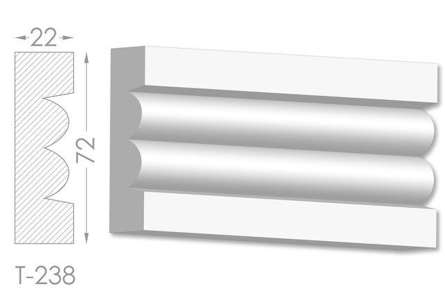Молдинг – (Тяга) - універсальний декоративний елемент з гіпсу, оригінальної форми, який використовується для кріплення на вертикальну площину. Виріб призначений для декорування внутрішніх стін приміщень. Мета-створення особливого візуального ефекту, зонування стельової області, верхньої частини стін, завершення дизайнерського інтер'єру, внесення «останніх штрихів». Конструкція виконана з якісних матеріалів, колір – білий, відповідний кольору сировини. Молдинг може бути декорований відповідно до обраної колірної гами стилем, пофарбованим в необхідний відтінок. Параметри виробу: висота – 72 мм, ширина – 22 мм.