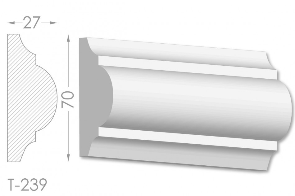 Молдинг – (Тяга) - універсальний декоративний елемент з гіпсу, оригінальної форми, який використовується для кріплення на вертикальну площину. Виріб призначений для декорування внутрішніх стін приміщень. Мета-створення особливого візуального ефекту, зонування стельової області, верхньої частини стін, завершення дизайнерського інтер'єру, внесення «останніх штрихів». Конструкція виконана з якісних матеріалів, колір – білий, відповідний кольору сировини. Молдинг може бути декорований відповідно до обраної колірної гами стилем, пофарбованим в необхідний відтінок. Параметри виробу: висота – 70 мм, ширина – 27 мм.