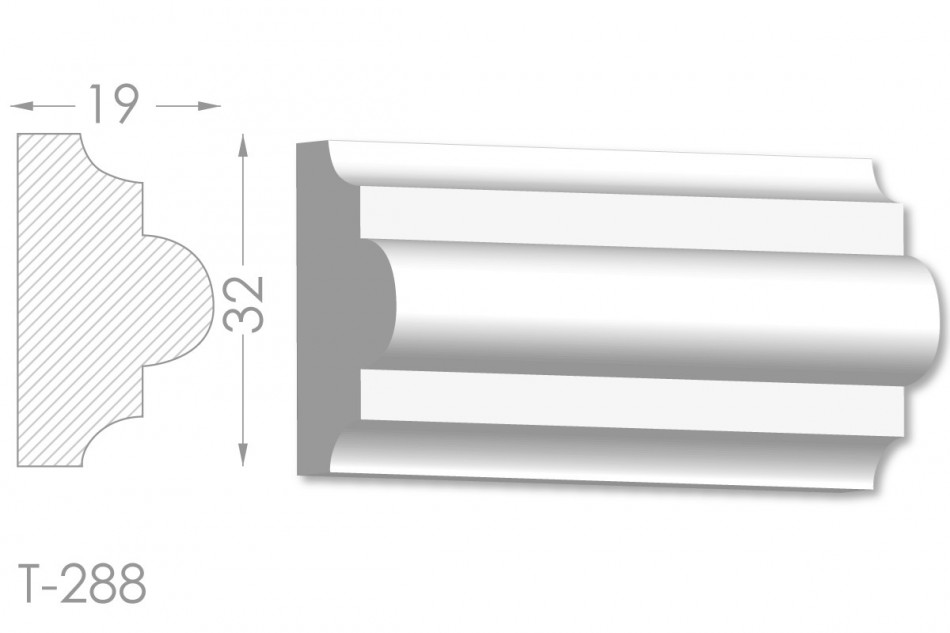 Молдинг – (Тяга) - універсальний декоративний елемент з гіпсу, оригінальної форми, який використовується для кріплення на вертикальну площину. Виріб призначений для декорування внутрішніх стін приміщень. Мета-створення особливого візуального ефекту, зонування стельової області, верхньої частини стін, завершення дизайнерського інтер'єру, внесення «останніх штрихів». Конструкція виконана з якісних матеріалів, колір – білий, відповідний кольору сировини. Молдинг може бути декорований відповідно до обраної колірної гами стилем, пофарбованим в необхідний відтінок. Параметри виробу: висота – 32 мм, ширина – 19 мм.