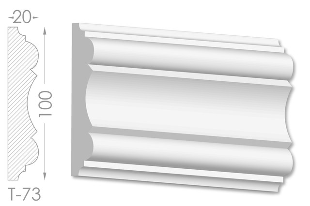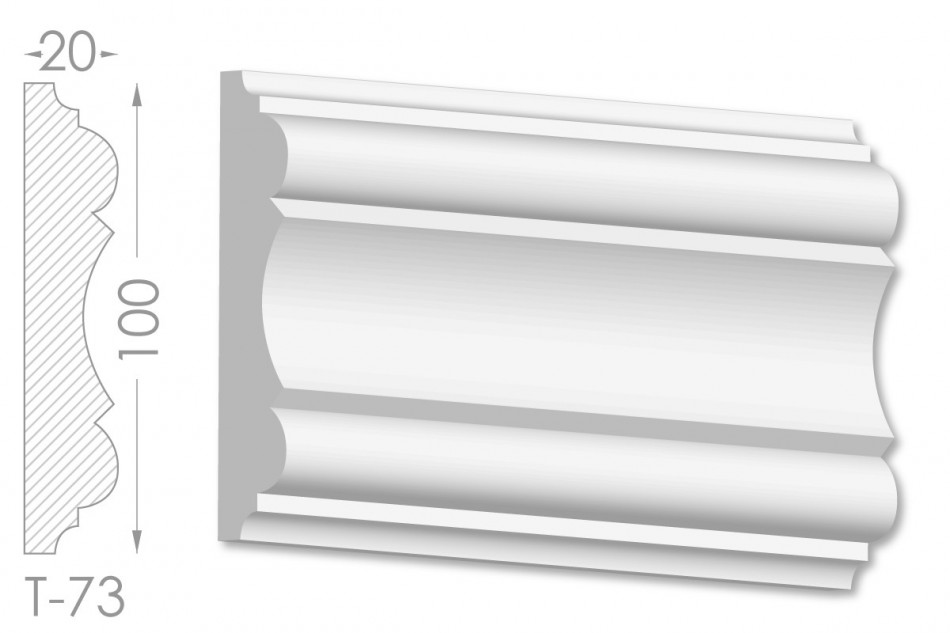 Молдинг – (Тяга) - універсальний декоративний елемент з гіпсу, оригінальної форми, який використовується для кріплення на вертикальну площину. Виріб призначений для декорування внутрішніх стін приміщень. Мета-створення особливого візуального ефекту, зонування стельової області, верхньої частини стін, завершення дизайнерського інтер'єру, внесення «останніх штрихів». Конструкція виконана з якісних матеріалів, колір – білий, відповідний кольору сировини. Молдинг може бути декорований відповідно до обраної колірної гами стилем, пофарбованим в необхідний відтінок. Параметри виробу: висота – 100 мм, ширина – 20 мм.