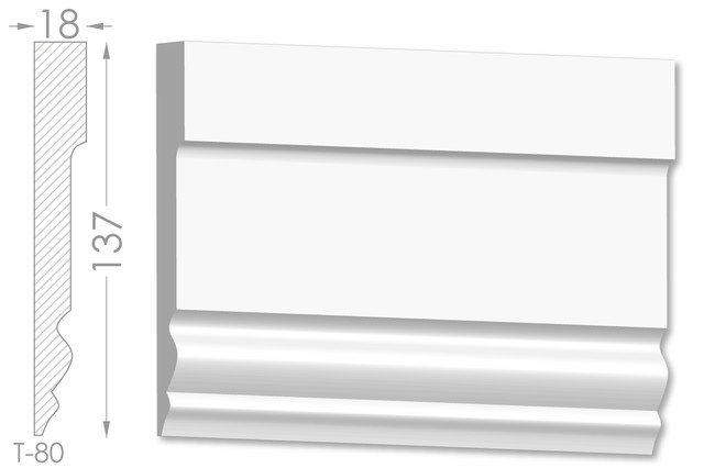 Молдинг – (Тяга) - універсальний декоративний елемент з гіпсу, оригінальної форми, який використовується для кріплення на вертикальну площину. Виріб призначений для декорування внутрішніх стін приміщень. Мета-створення особливого візуального ефекту, зонування стельової області, верхньої частини стін, завершення дизайнерського інтер'єру, внесення «останніх штрихів». Конструкція виконана з якісних матеріалів, колір – білий, відповідний кольору сировини. Молдинг може бути декорований відповідно до обраної колірної гами стилем, пофарбованим в необхідний відтінок. Параметри виробу: висота – 137 мм, ширина – 18 мм.