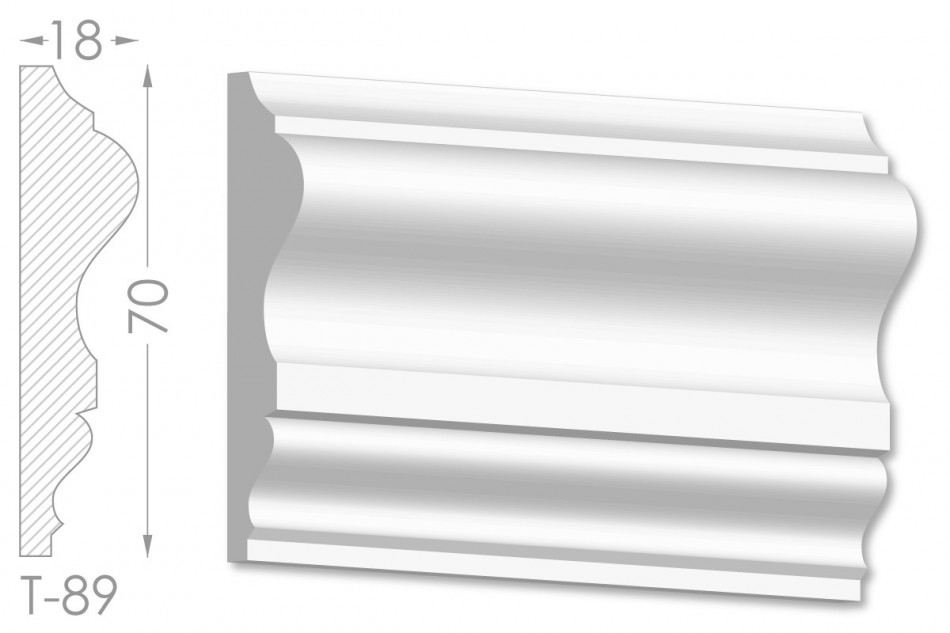 Молдинг – (Тяга) - універсальний декоративний елемент з гіпсу, оригінальної форми, який використовується для кріплення на вертикальну площину. Виріб призначений для декорування внутрішніх стін приміщень. Мета-створення особливого візуального ефекту, зонування стельової області, верхньої частини стін, завершення дизайнерського інтер'єру, внесення «останніх штрихів». Конструкція виконана з якісних матеріалів, колір – білий, відповідний кольору сировини. Молдинг може бути декорований відповідно до обраної колірної гами стилем, пофарбованим в необхідний відтінок. Параметри виробу: висота – 70 мм, ширина – 18 мм.