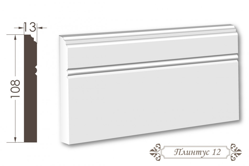 Плінтус 12 — спеціалізований гіпсовий плінтус висотою 108 мм та шириною 13 мм, розроблений для оздоблення стилізованого переходу від стіни до стелі з сучасною, архітектурно компактною конструкцією. Його архітектурний профіль з геометричною пропорцією та сучасним дизайном створює архітектурно модерний ефект, надаючи інтер'єру елегантності, технологічної утонченості та архітектурної сучасності.