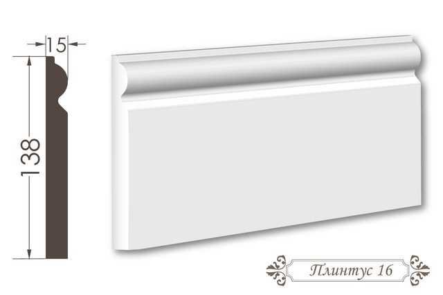 Плінтус 16 — спеціалізований гіпсовий плінтус висотою 138 мм та шириною 15 мм, розроблений для оздоблення стилізованого переходу від стіни до стелі з класичною, архітектурно розширеною конструкцією. Його архітектурний профіль з пропорціональною формою та класичним дизайном створює архітектурно гармонійний ефект, надаючи інтер'єру елегантності, традиційної витонченості та архітектурної гармонії.