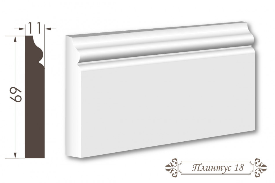Плінтус 18 — спеціалізований гіпсовий плінтус висотою 69 мм та шириною 11 мм, розроблений для оздоблення стилізованого переходу від стіни до стелі з сучасною, компактною архітектурною конструкцією. Його архітектурний профіль з геометричною формою та мінімалістичним дизайном створює архітектурно модерний ефект, надаючи інтер'єру елегантності, технологічної утонченості та архітектурної сучасності.
