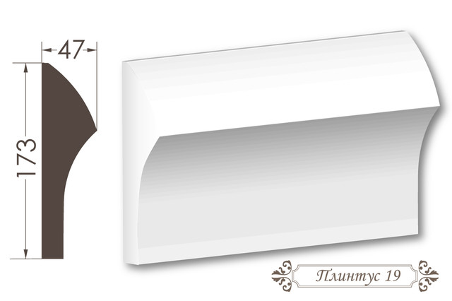 Плінтус 19 — спеціалізований гіпсовий плінтус висотою 173 мм та шириною 47 мм, розроблений для оздоблення стилізованого переходу від стіни до стелі з декоративною, архітектурно вигнутою конструкцією. Його архітектурний профіль з вигнутою пропорцією та елегантним дизайном створює архітектурно багатий ефект, надаючи інтер'єру елегантності, традиційної витонченості та архітектурної вишуканості.