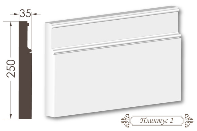 Плінтус 2 (Т-96) — спеціалізований гіпсовий плінтус висотою 250 мм та шириною 35 мм, розроблений для оздоблення стилізованого переходу від стіни до стелі з преміум-класу архітектурною конструкцією. Його архітектурний профіль з розширеною пропорцією та елегантним дизайном створює архітектурно престижний ефект, надаючи інтер'єру елегантності, традиційної витонченості та архітектурної величавості.