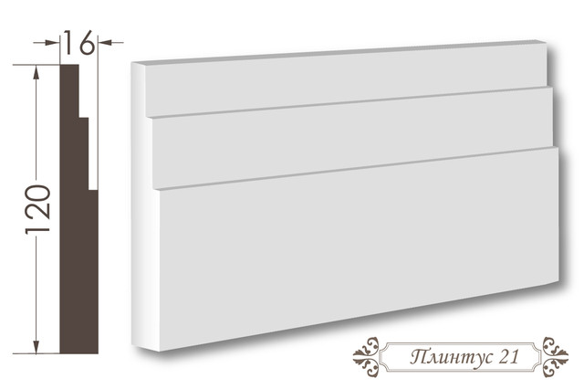 Плінтус 21 — спеціалізований гіпсовий плінтус висотою 120 мм та шириною 16 мм, розроблений для оздоблення стилізованого переходу від стіни до стелі з сучасною, компактною архітектурною конструкцією. Його архітектурний профіль з геометричною формою та мінімалістичним дизайном створює архітектурно модерний ефект, надаючи інтер'єру елегантності, технологічної утонченості та архітектурної сучасності.
