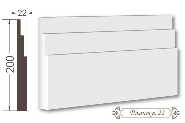 Плінтус 22 — спеціалізований гіпсовий плінтус висотою 200 мм та шириною 22 мм, розроблений для оздоблення стилізованого переходу від стіни до стелі з декоративною, архітектурно розширеною конструкцією. Його архітектурний профіль з пропорціональною формою та елегантним дизайном створює архітектурно багатий ефект, надаючи інтер'єру елегантності, традиційної витонченості та архітектурної вишуканості.