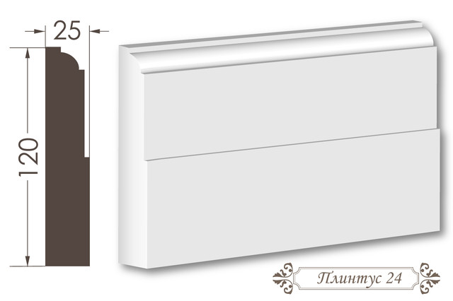 Плінтус 24 — спеціалізований гіпсовий плінтус висотою 120 мм та шириною 25 мм, розроблений для оздоблення стилізованого переходу від стіни до стелі з декоративною, архітектурно розширеною конструкцією. Його архітектурний профіль з пропорціональною формою та елегантним дизайном створює архітектурно багатий ефект, надаючи інтер'єру елегантності, традиційної витонченості та архітектурної вишуканості.