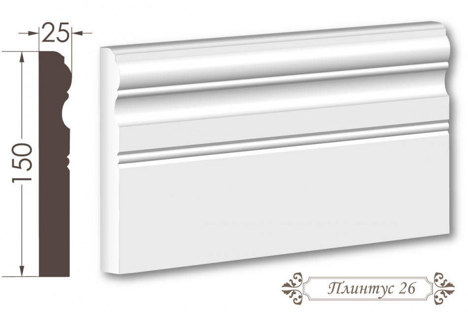 Конструкція виконана з якісних матеріалів, колір - білий, відповідний кольору сировини. Молдинг може бути декорований відповідно до обраної кольоровою гамою стилем, забарвлений в необхідний відтінок. Параметри вироби: висота – 150 мм, ширина – 25 мм.