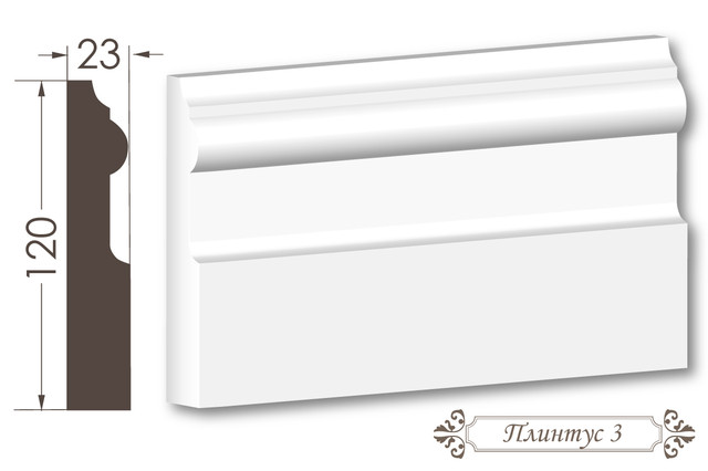 Плінтус 3 — спеціалізований гіпсовий плінтус висотою 120 мм та шириною 23 мм, розроблений для оздоблення стилізованого переходу від стіни до стелі з сучасною, компактною архітектурною конструкцією. Його архітектурний профіль з геометричною формою та мінімалістичним дизайном створює архітектурно модерний ефект, надаючи інтер'єру елегантності, технологічної утонченості та архітектурної сучасності.