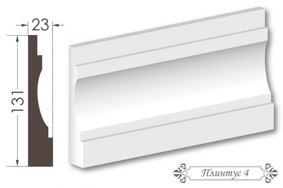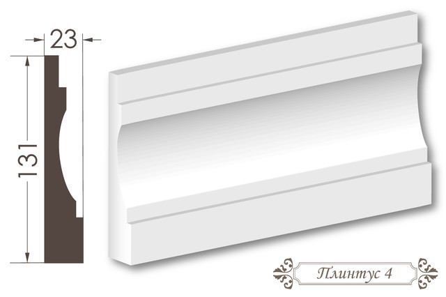 Плінтус 4 — спеціалізований гіпсовий плінтус висотою 131 мм та шириною 23 мм, розроблений для оздоблення стилізованого переходу від стіни до стелі з декоративною, архітектурно вигнутою конструкцією. Його архітектурний профіль з органічною формою та елегантним дизайном створює архітектурно багатий ефект, надаючи інтер'єру елегантності, традиційної витонченості та архітектурної вишуканості.
