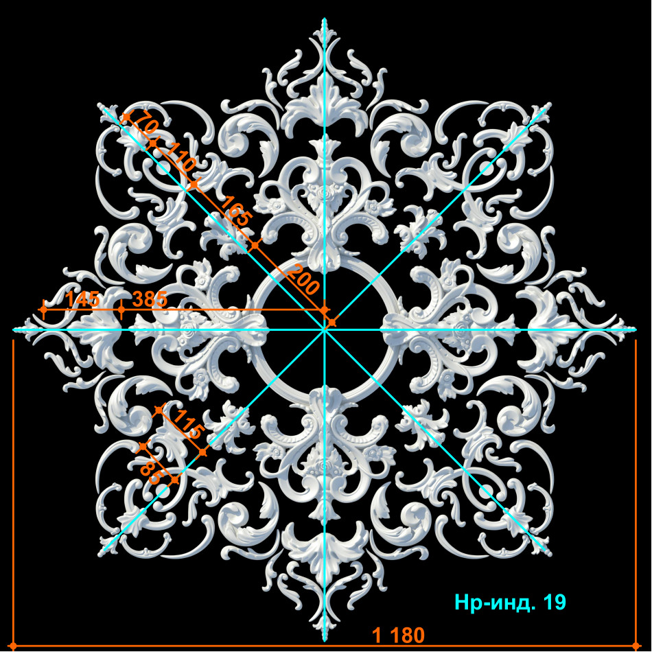 Набірна стельова розетка в стилі бароко, восьмикутної форми, з розмірами в максимальному перетині 1180 мм.