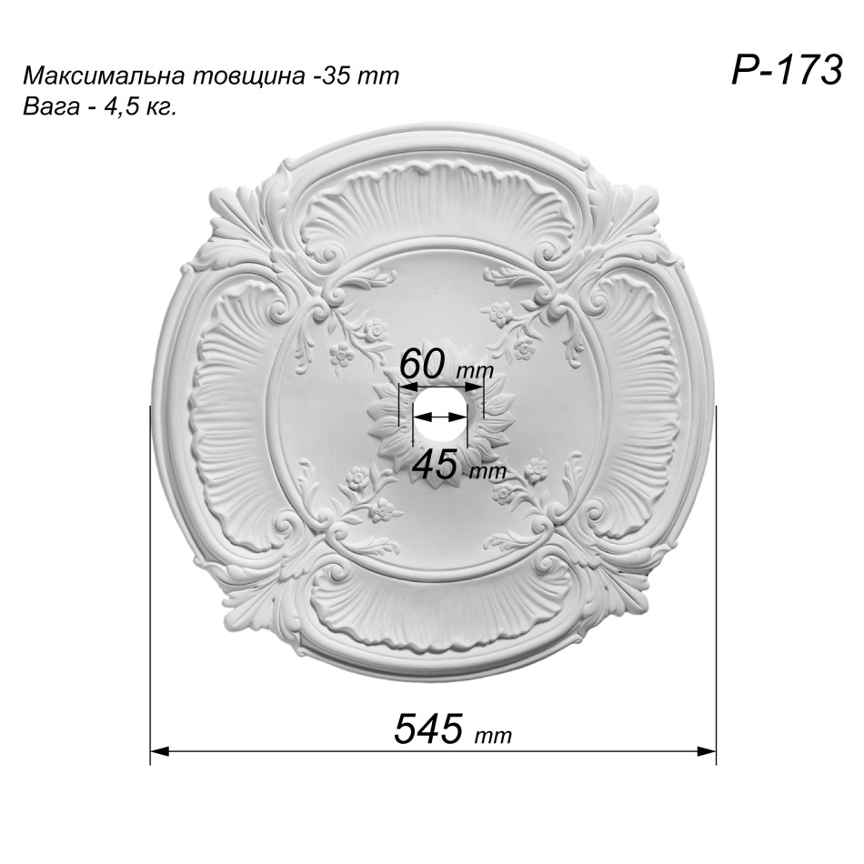 Особливості Розетка стельова з гіпсу Р-173 Ø545 мм: