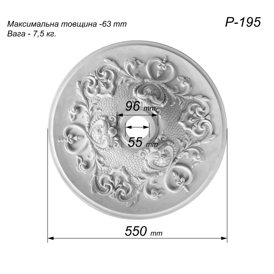 Особливості Розетка стельова з гіпсу Р-195 Ø550 мм:
