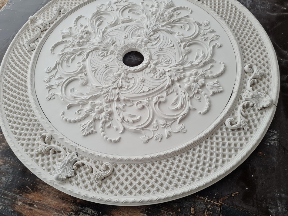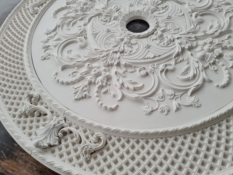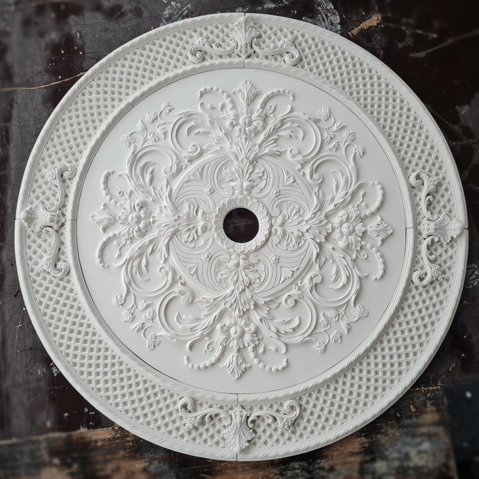 Розетка гіпсова в стилі рококо з витонченим малюнком та сіткою по канту р-250 а Ø1200
