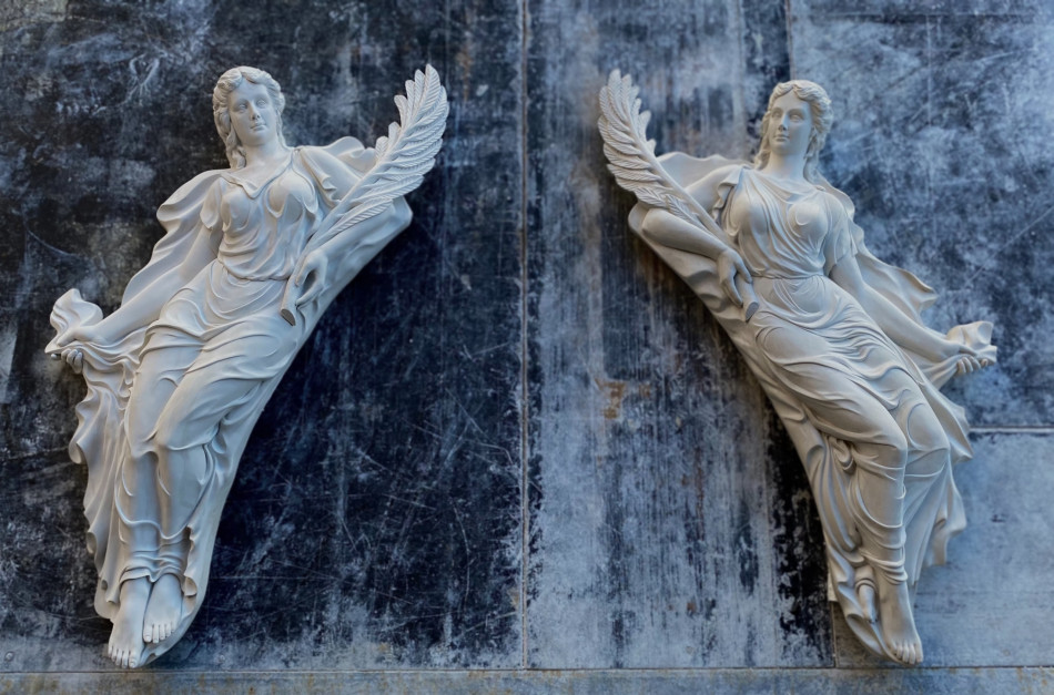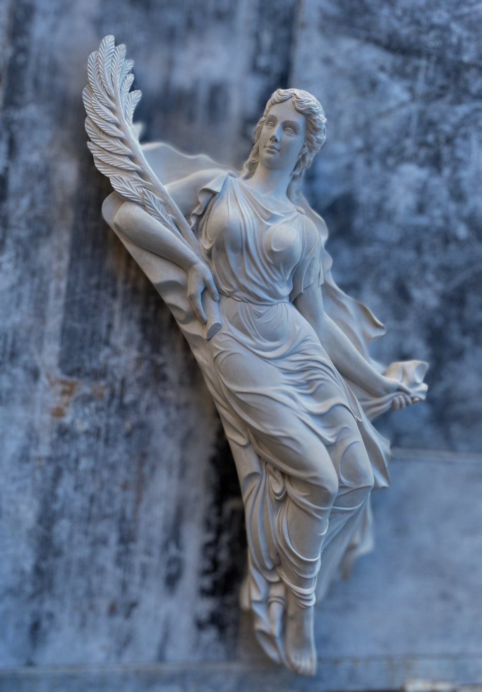 - Виразна скульптурна композиція з крилами та деталізованим портретом;