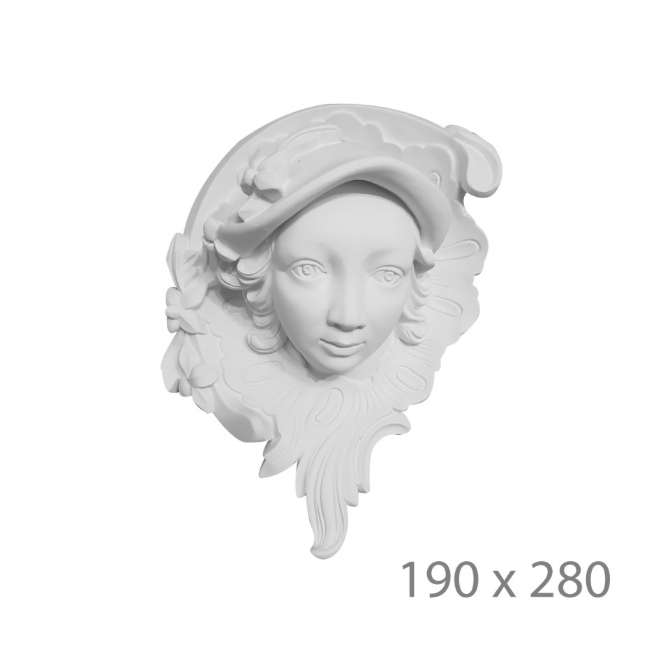 КР-5 — гіпсова каріатида висотою 190 мм та шириною 280 мм з виразною антропоморфною головою жінки. Скульптура являє собою вишуканий декоративний елемент у формі портрета, прикрашеного деталізованими рисами, вишуканим головним убором та барельєфною пластикою. Її плавні лінії та елегантний рельєф створюють ощуття витонченості та величавості, типове для інтер'єрів класицизму та неокласики.