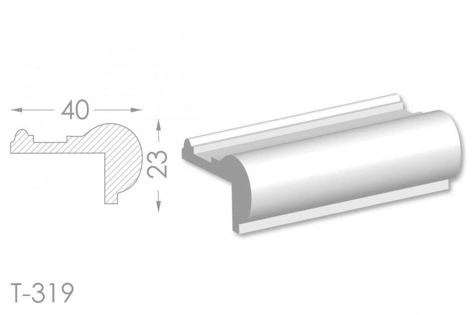 Молдинг – (Тяга) - універсальний декоративний елемент з гіпсу, оригінальної форми, який використовується для кріплення на вертикальну площину. Виріб призначений для декорування внутрішніх стін приміщень. Мета-створення особливого візуального ефекту, зонування стельової області, верхньої частини стін, завершення дизайнерського інтер'єру, внесення «останніх штрихів». Конструкція виконана з якісних матеріалів, колір – білий, відповідний кольору сировини. Молдинг може бути декорований відповідно до обраної колірної гами стилем, пофарбованим в необхідний відтінок. Параметри виробу: висота – 23 мм, ширина – 40 мм.