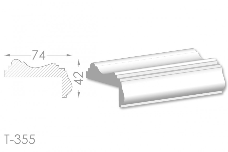 Молдинг – (Тяга) - універсальний декоративний елемент з гіпсу, оригінальної форми, який використовується для кріплення на вертикальну площину. Виріб призначений для декорування внутрішніх стін приміщень. Мета-створення особливого візуального ефекту, зонування стельової області, верхньої частини стін, завершення дизайнерського інтер'єру, внесення «останніх штрихів». Конструкція виконана з якісних матеріалів, колір – білий, відповідний кольору сировини. Молдинг може бути декорований відповідно до обраної колірної гами стилем, пофарбованим в необхідний відтінок. Параметри виробу: висота – 42 мм, ширина – 74 мм.