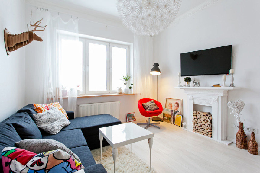 - наявність фальш каміна у вітальні значно розширює діапазон реалізації найбільш незвичайних дизайнерських рішень.